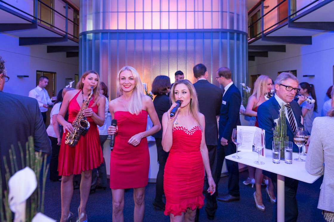 Eine mobile Damenband wanderte durch die Gäste und verlieh dem Fest eine bewegte Leichtigkeit. Musik, die nicht Bühnen braucht, sondern Nähe schafft. So entstehen Kontraste, die Energie freisetzen und Gespräche auf natürliche Weise vertiefen. Employer Branding beginnt dort, wo Menschen gerne verweilen.
