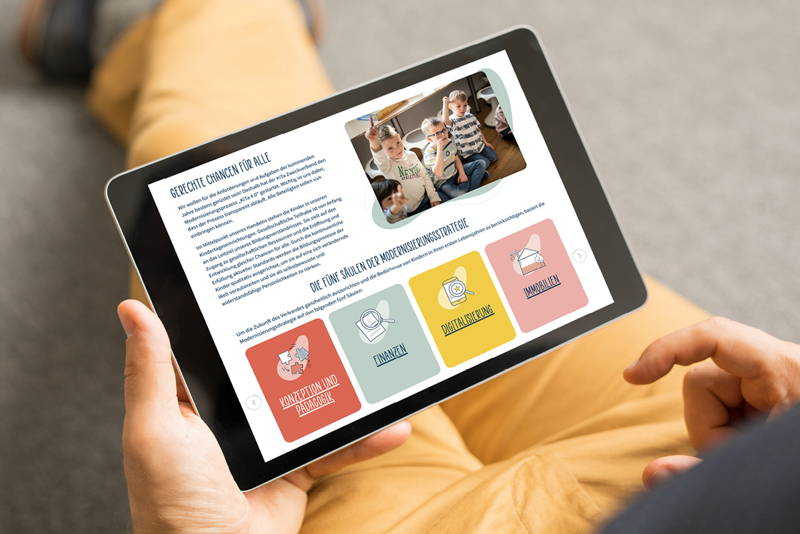 Unser Corporate Design lebt in allen Bereichen. Die neue Website wurde von uns als Herzstück der Markenpräsenz konzipiert. Sie vereint Screendesign, informative Inhalte und interaktive Formate für Mitarbeitende und Interessierte. Go-live und Launch begleiteten wir mit Erklärvideos, die die Neuerungen anschaulich machen, und einer Karriere-Seite, die zeigt, warum der KiTa Zweckverband ein attraktiver Arbeitgeber ist.